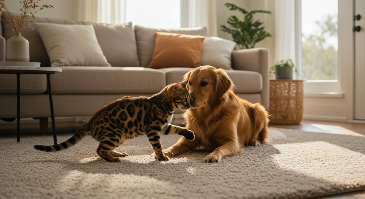 Introduire un Bengal dans un foyer où vivent déjà d’autres animaux — ou accueillir un nouvel animal quand on a déjà un Bengal — soulève beaucoup de questions. Le Bengal est-il sociable avec les chiens ? Peut-il cohabiter avec un autre chat ? Et les petits animaux comme les lapins ou les hamsters ? Voici mon retour d’expérience après des années passées à gérer une maisonnée multi-espèces.