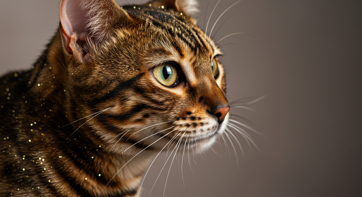 Le fameux « glitter » est une particularité génétique unique au Bengal. Il s’agit de minuscules poches d’air à l’intérieur de la tige du poil qui captent et reflètent la lumière, donnant l’impression que le chat est recouvert d’une fine poussière d’or ou d’argent. Tous les Bengals ne présentent pas de glitter, mais quand il est présent, l’effet est absolument saisissant en plein soleil.