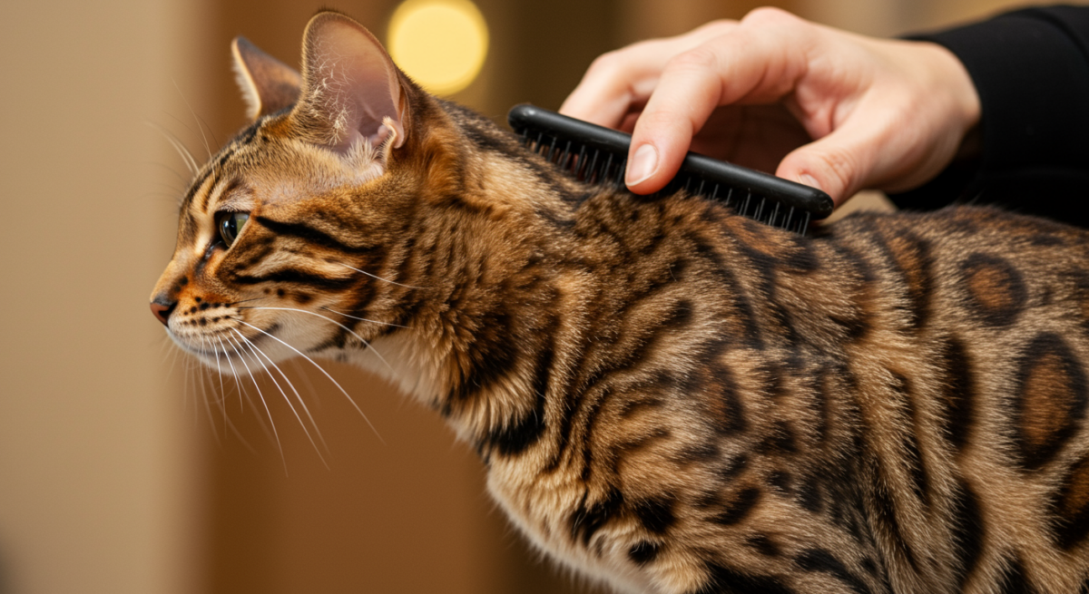 Le Bengal possède un pelage court, dense et très doux qui ne s’emmêle pas et ne forme pas de bourres. Un brossage hebdomadaire avec un gant en caoutchouc ou une brosse douce suffit à éliminer les poils morts et à stimuler la circulation sanguine.